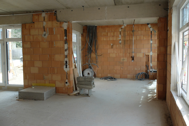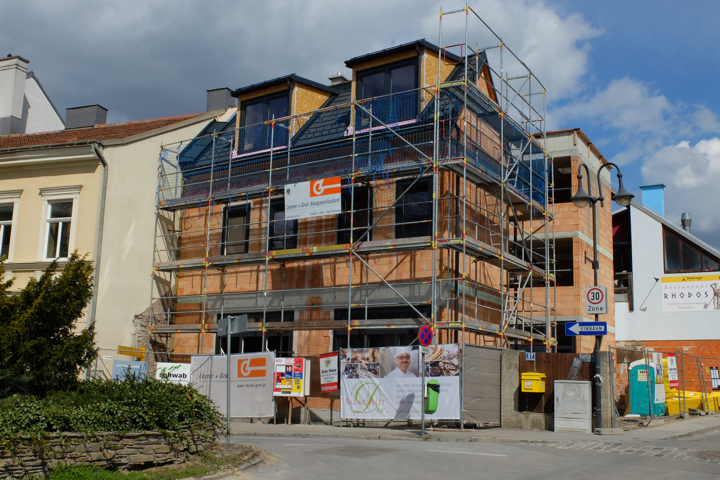 Das Dach, wurde durch die Frima WIBA soweit fertiggestellt, dass die noch ausständigen Spenglerarbeiten mit dem Herstellen der Fassade beendet werden können. Die Firma hmelectric ist schon mit dem Einziehen der Verkabelung beschäftigt und die Firma ht-service-fasching, wird den ersten Teil der Heizungs- und Sanitärinstallationen bis Mitte April abgeschlossen haben und somit kann die Firma Leyrer + Graf, die auch den Rohbau hergestellt hat, mit dem Innenputz der Wände beginnen. Anmerken möchte ich noch, dass der Dachstuhl durch die Firma Hermine Schwab erstellt wurde und die Fenster & Türen derzeit gerade von der Firma Gebrüder Haas eingebaut werden. Die Planung des Gebäudes selbst, erfolgte durch die Architektur Lüdtke. Die weiteren Arbeiten sind in Vorbereitung bzw. teilweise schon vergeben (Innenausbau an die Firma Pop). BackenMitDir.at, wird von der ersten Idee an, grafisch hervorragend durch die Firma livingCreation, begleitet.