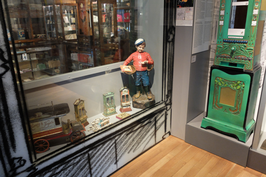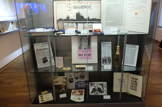Weiter im Obergeschoß, der großen Ausstellungshalle, finden wir dann einige, auch heute noch gängige Maschinen und Hohlgußformen. Eine Trüffelüberzugsanlage ist ganz nahe für den Besucher, in Betrieb zu beobachten. Neu jedoch ist die Möglichkeit für Besucher, sich seine eigene Schokoladentafel zu kreiern. Durch Angabe der verschiedenen Zutaten, wird von einer Mitarbeiterin, die jeweilige Schokoladentafel gegossen (milch, dunkel oder weiß) und mit den ausgewählten Zutaten bestreut. Nach einer kurzen Abkühlphase und bezahlen der Rechnung, können Sie diese sofort genüßlich verzehren oder auch verpackt mit nach Hause nehmen.