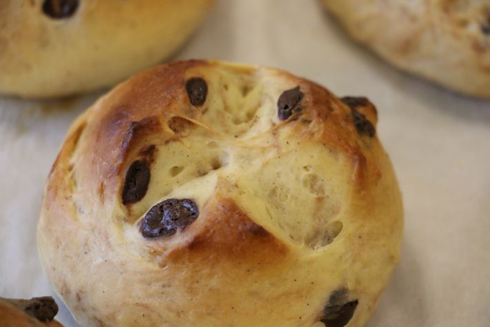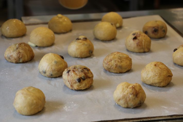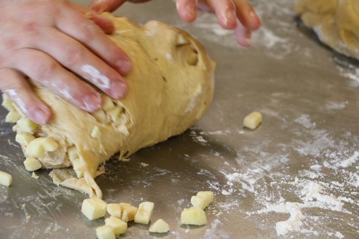 Die Lösung hierfür war dann eigentlich recht einfach. Da ich ja selbst gerne Konditoreien besuche, um Süßes zu genießen und ich mich immer über Pinzen ärgere, in denen entweder Orangeat, Mandelstifte (oder beides) bzw. noch schlimmer Anis (uff!), mit eingewirkt ist, war es an der Zeit, geschmacklich genüßlichere Zutaten zu finden. Somit bin ich recht schnell bei frisch gewürfelten  Äpfeln und Schokoladentropfen gelandet!