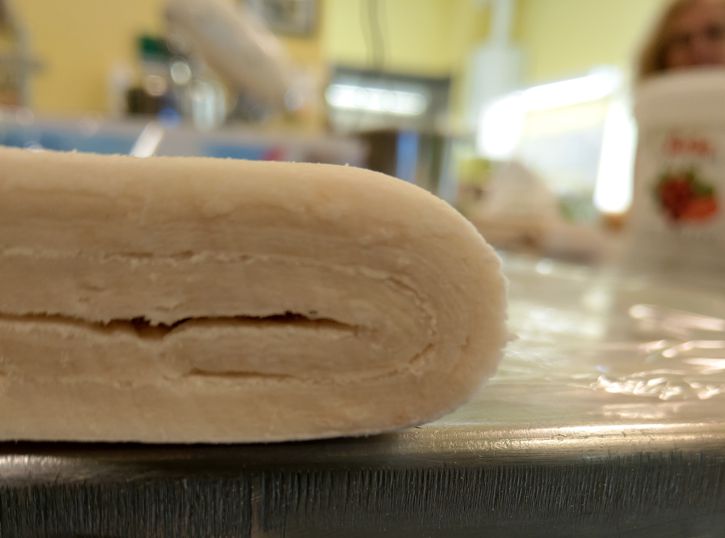 - Und wenn man alles richtig gemacht hat, erkennt man die einzelnen Schichten des Schmerstrudelteig