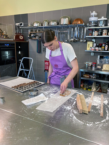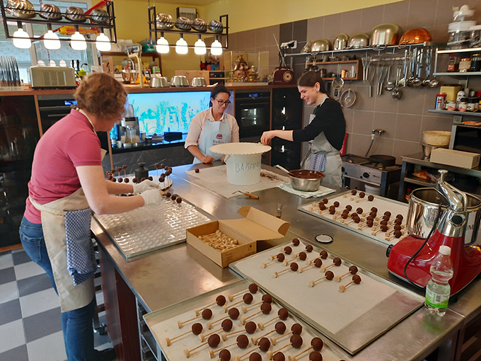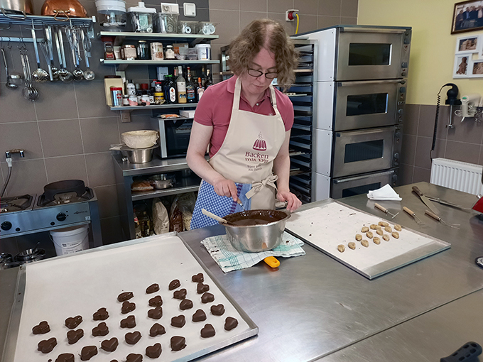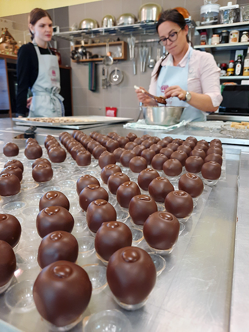 - Daniela beginnt bereits mit dem Deckeln unserer gefüllten Hohlkörperpralinen
