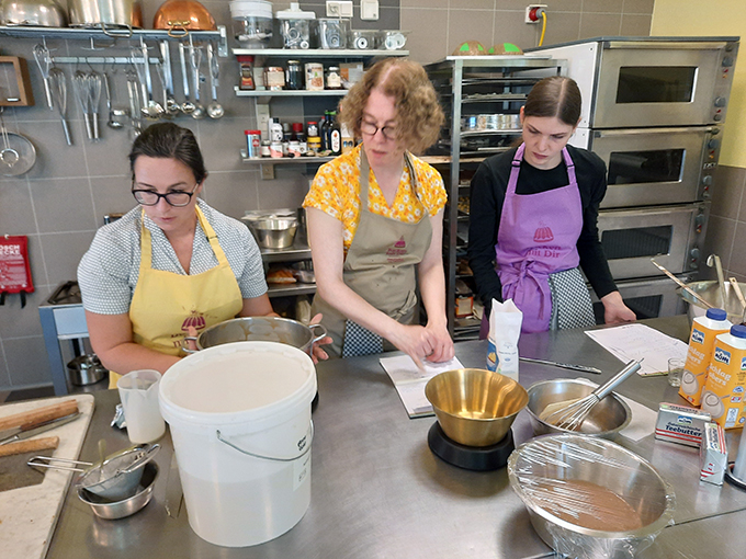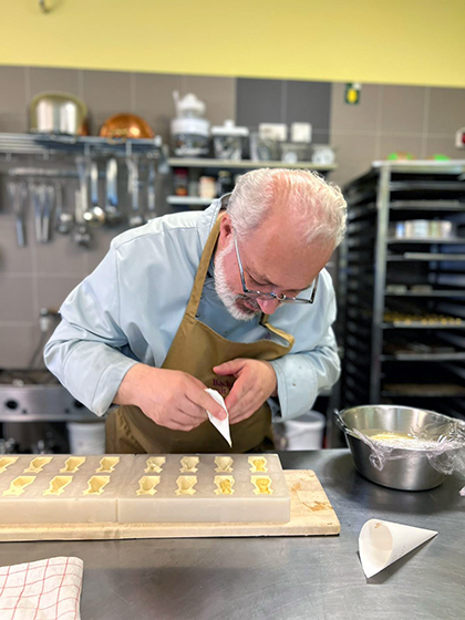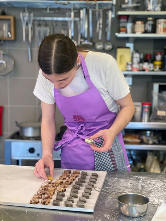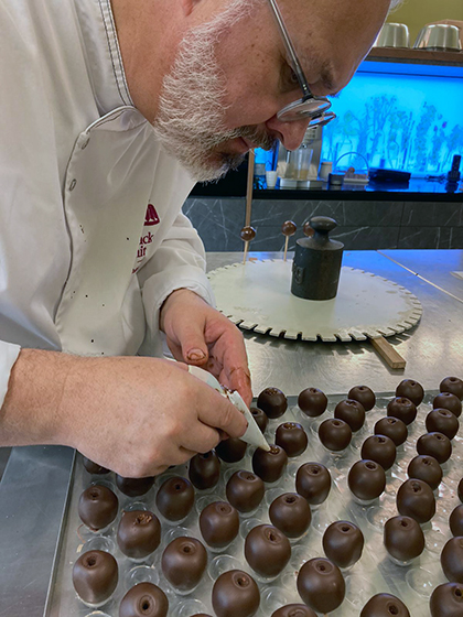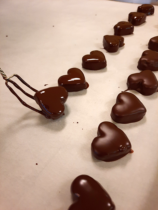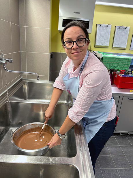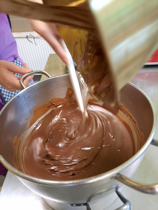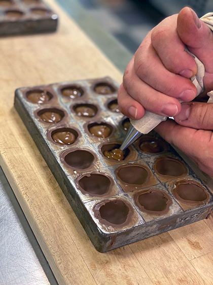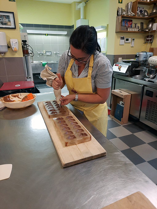 - Zurück zum Thema Praline. Daniela beim Füllen mit weichem temperiertem Nougat