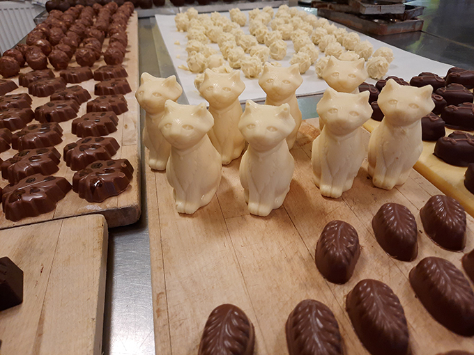 - Die weißen Schokoladenkätzchen sind mit Eierlikör-Canache gefüllt worden